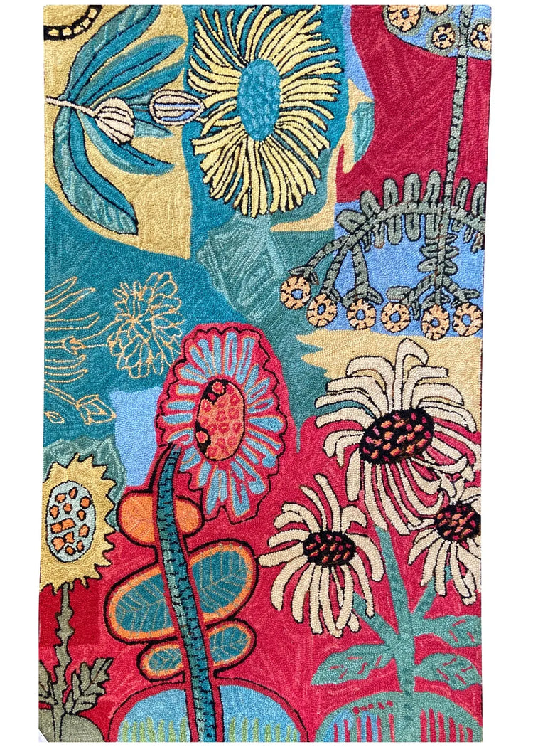 Vibrant abstract mums are scattered all about. This whimsical Bloomer rug is inspired by original artwork from Barbara Gilhooly Mighty Fine Art.