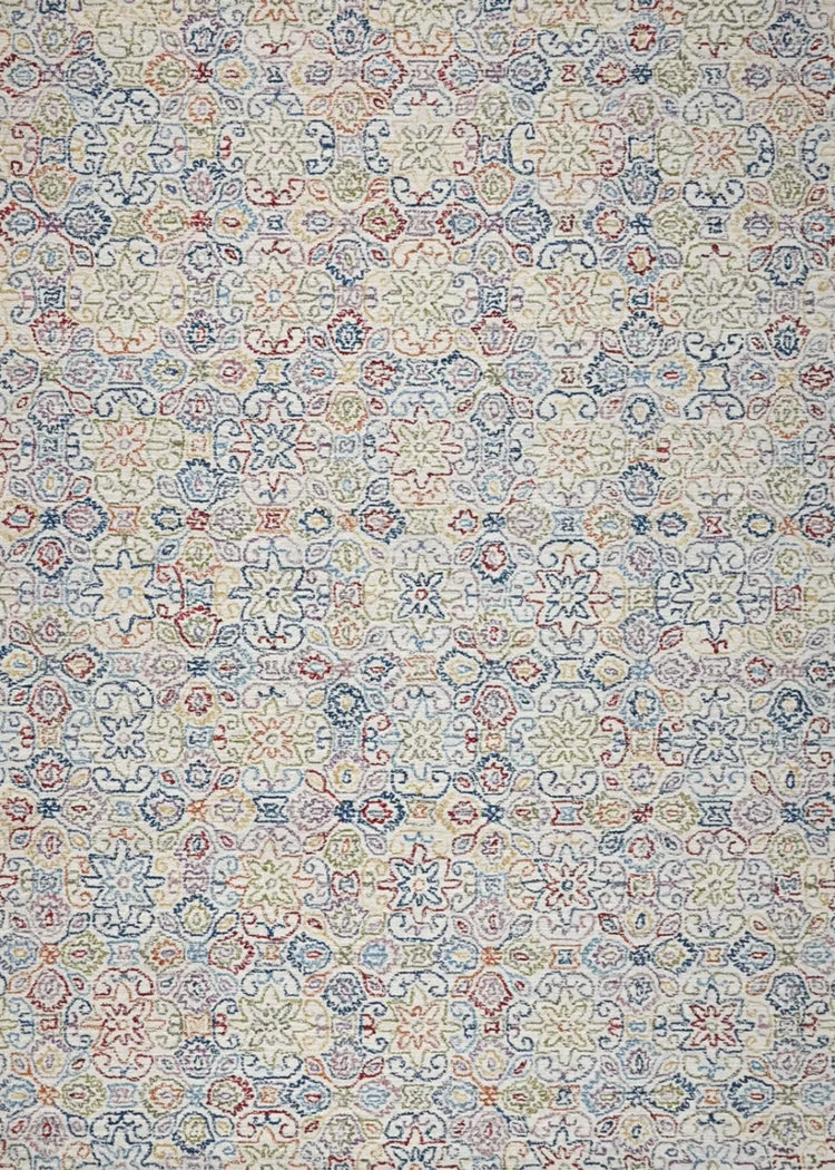 Inspired by cross stitch designs traditional to many cultures around the world, this multicolor rug on a natural ground is a perfect complement to many room styles. The pure wool loop pile is a wonderfully soft foundation.