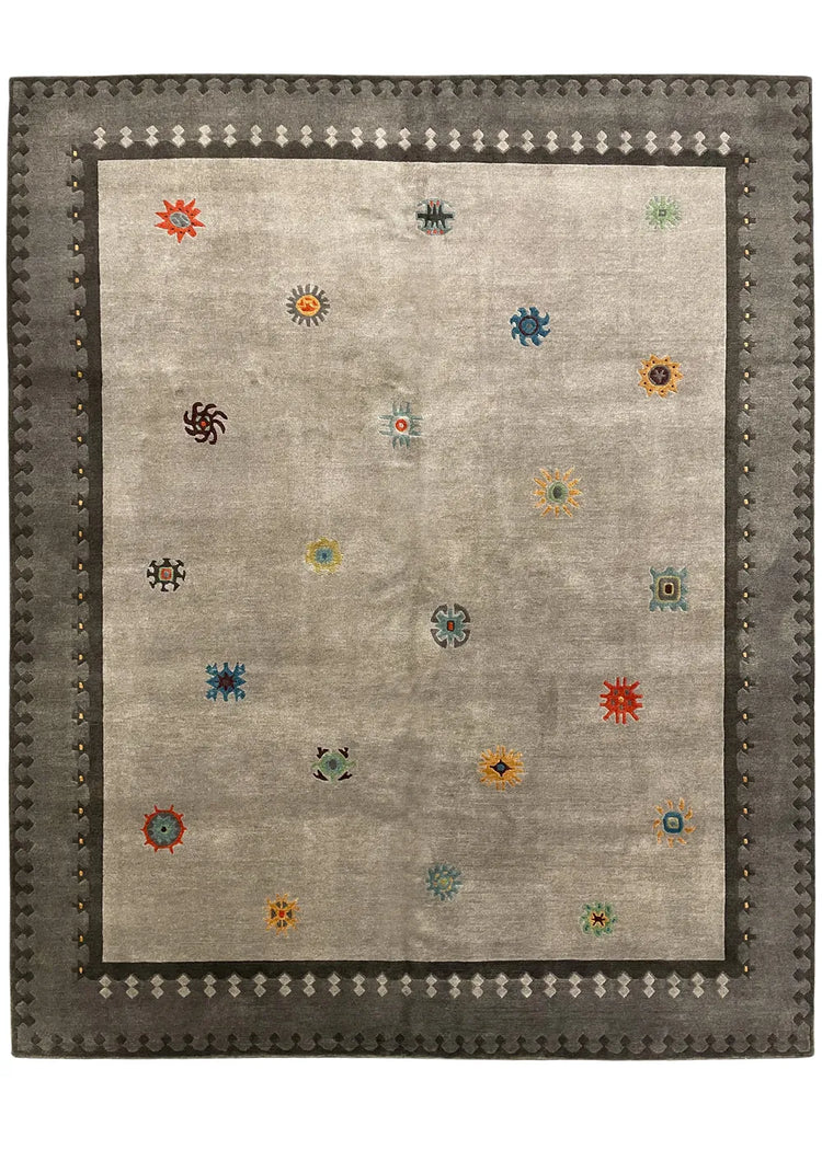 Designed by artist Laurie Downing, this plush wool rug is hand knotted with a sun symbol design in soft, earthy shades of Tibetan Wool. 60 knots
